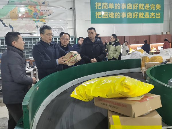在一樓大平面作業場地,張航一行先后來到仙來攬投部、郵件處理中心和“愛心福袋”現場,向奮斗在一線的郵政員工送上了新春祝福和新年問候,并詢問郵件進出口量、了解信息系統、查看助農扶貧產品等郵政生產情況。張航勉勵郵政員工一定要注意安全,做好服務,當好使者。