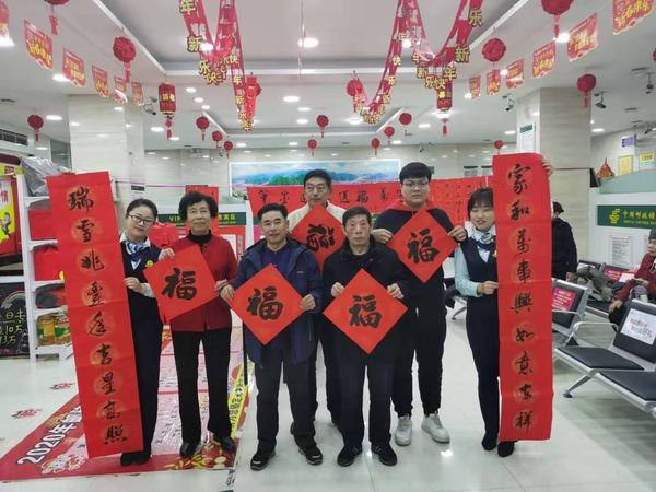 書法家協會的各位老師們深入到圖們市分公司圖們大路營業所、向上營業所,為廣大客戶和基層金融員工寫對聯,送福字。以實際行動踐行習近平總書記“把最好的精神食糧奉獻給人民”的號召,為郵政網點營造了喜慶祥和的節日氛圍,讓圖們郵政的忠實客戶與基層員工共享美好的精神食糧。