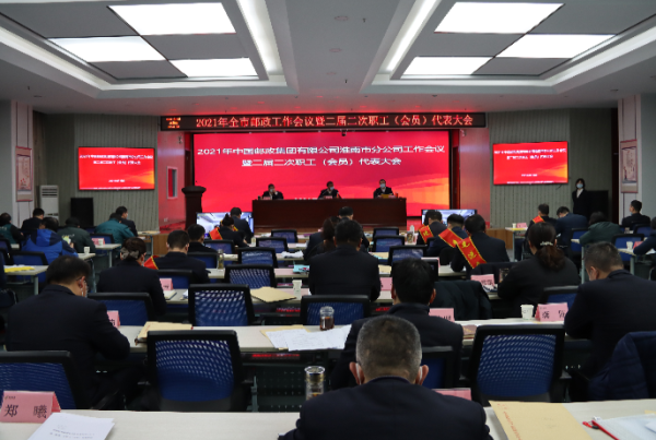 1月21日上午,淮南郵政2021工作會議暨二屆二次職工(會員)代表大會隆重召開。市分公司領導班子成員;縣分公司主要負責人;全市四級副及以上人員;職工代表參加了會議,會議設市、縣兩級會場,以現場+視頻的方式同步進行。