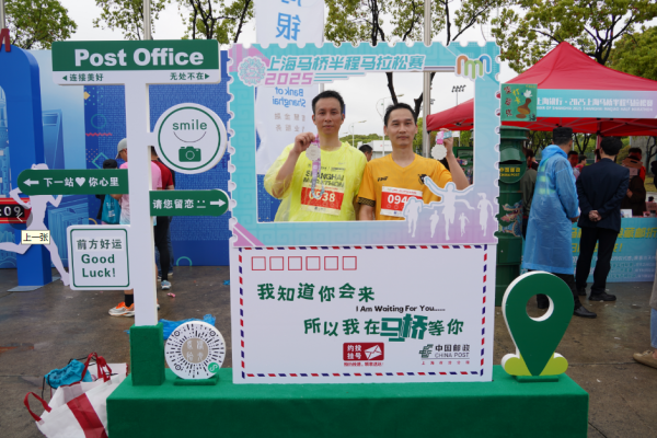 比賽當日,閔行郵政積極參與其中,為跑者們帶來了獨具紀念價值的特色體驗。在賽道旁,閔行區分公司馬橋郵政支局特別服務區域成為了一道亮麗的風景線。這里不僅提供了豐富的集郵品和文創產品,如具有紀念意義的明信片、冰箱貼等,還特別設置了現場定制個性化“有聲明信片”的服務。跑者們可以在這里記錄下自己的比賽瞬間和心路歷程,將這份珍貴的記憶以明信片的形式永久保存。