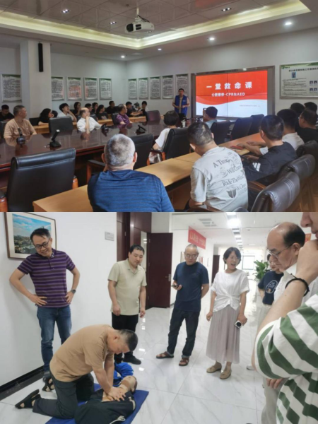 為強化健康保障,給員工提供更加全面和專業的健康支持,7月9日,省信息技術中心工會聯系邁瑞醫療廠家,組織開講“一堂救命課”,科普日常急救知識。圍繞“拯救黃金4分鐘”主題,培訓講師通過圖文視頻動畫,演示并講解了心臟工作原理、AED除顫原理、心臟驟停緊急處理流程,以及心肺復蘇(CPR)和人工呼吸的操作要點,大家聽得認真而專注。隨后大家來到大廳走廊,在培訓講師示范帶領下,大家利用AED訓練機和訓練假人,開展急救模擬實操練習。在講師耐心指導下,在訓練機反復提示下,大家從一開始既緊張又興奮的忙亂,逐漸變得從容不迫,可以按照動作要領有效完成整套急救流程。通過學習和訓練,大家參與并代入到現場群眾性救護狀態,掌握了基本救護常識和施救原則,學習了重要急救技能,培養了“人人學急救,人人敢急救”的良好社會責任意識,也實現了“一堂救命課”的真正意義。