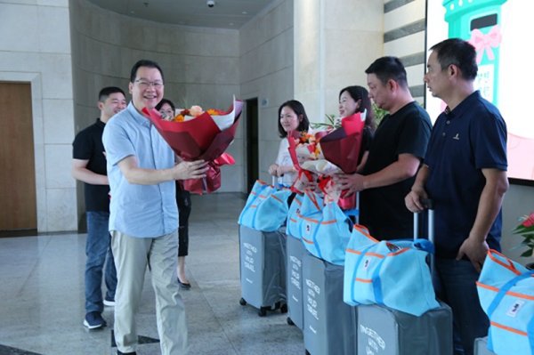 工會主席吳水軍為員工送上鮮花與定制慰問品,大屏幕 “青春逐夢 郵政相伴” 標語格外醒目,傳遞著郵政對員工家屬追夢的支持。
