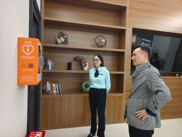 在橫街網點負責人的陪同下,陳金彥一行先行參觀了驛站各功能區域。從設有茶桌、冰箱的休息區,到存放微波爐、急救箱、血壓計、針線盒的便民角,再到戶外勞動者的手機充電處、AED除顫儀安裝處,每到一處都駐足詢問。“平時每天大概有多少戶外勞動者來休息?”“有沒有組織過戶外人員的專場活動?”針對這些問題,網點工作人員逐一詳細匯報。