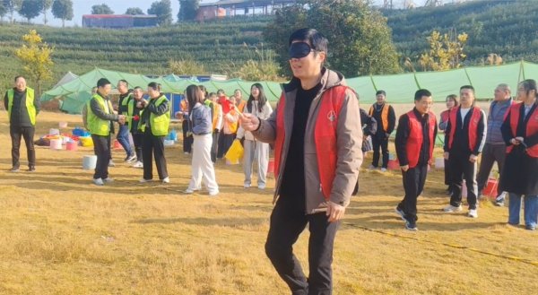 蒙眼敲鑼項目同樣人氣爆棚,蒙眼后原地轉三圈,在隊友的指引下摸索前行,有的步履穩健精準敲中,引得全場歡呼;有的步履踉蹌偏離方向,逗得眾人捧腹大笑,歡樂氛圍持續升溫。