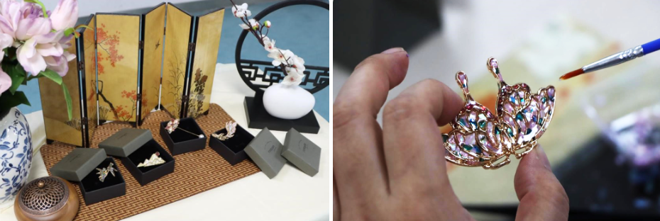 活動現場,非遺指導老師首先為大家細致講解螺鈿鑲嵌的歷史淵源與藝術特色。這項起源于商周時期的傳統裝飾技藝,以天然貝殼為原料,歷經裁切、打磨、鑲嵌、拋光等多道精細工序,最終呈現出斑斕閃爍的視覺效果。在老師的分步示范與耐心指導下,員工們紛紛動手創作:從圖案設計、布局定位,到螺片切割、精準拼接,再到貼合固定、局部拋光,每一個步驟都專注細致。原本樸素的胸針底托上,漸漸綴滿貝片拼合的花葉紋樣,指尖流轉間,一件件融入個人巧思、獨具風格的螺鈿胸針悄然成型。