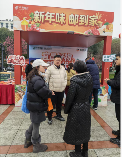 廟會現(xiàn)場,宜昌郵政設(shè)立的展位前人氣頗旺。五峰的臘肉、香腸,秭歸的鮮橙,枝江的大米,點軍的蜜柚等來自宜昌各縣(市、區(qū))的特色農(nóng)產(chǎn)品整齊陳列,吸引了不少市民駐足品嘗、購買。