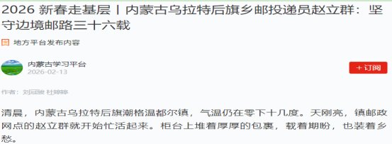 趙立群是內(nèi)蒙古烏拉特后旗鄉(xiāng)郵投遞員。近日,關(guān)于他的先進(jìn)事跡《2026 新春走基層—-內(nèi)蒙古烏拉特后旗鄉(xiāng)郵投遞員趙立群:堅守邊境郵路三十六載》報道在“學(xué)習(xí)強國”內(nèi)蒙古地方平臺刊發(fā)。
