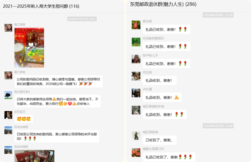 東莞郵政始終秉持“以人為本”的發展理念,高度重視人才隊伍建設。春節前夕,為入局近5年的110名大學生及家屬,郵寄了感謝信與新春慰問品,向默默支持東莞郵政高質量發展的家屬們表達感恩之情、致謝之意;同時向全體大學生及家屬致以最誠摯的新春問候,這份貼心關懷讓收到慰問的大學生們倍感驚喜、深受鼓舞。